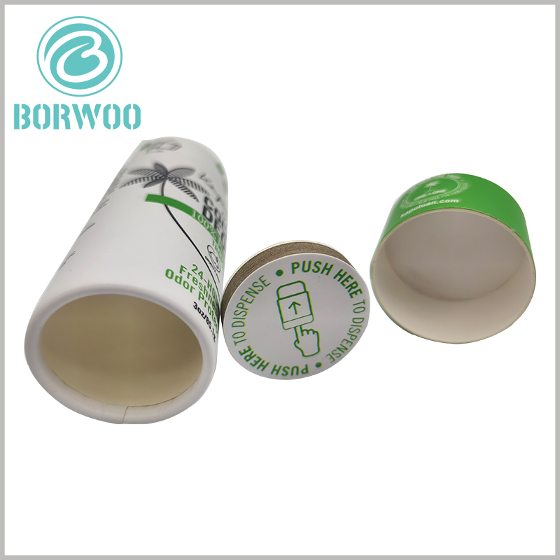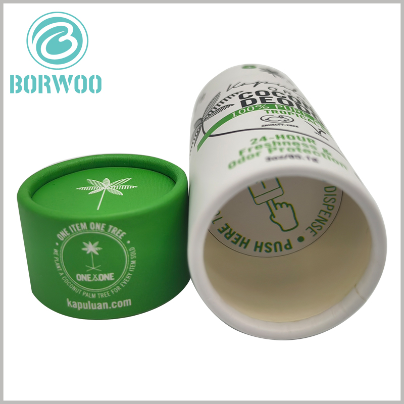 This is a 3Oz deodorant packaging we provide for a coconut product brand in the United States. The diameter of the paper tube is 40mm and the height is 100mm. It is for coconut deodorant products. If your deodorant type is different, the size of the paper tube packaging will vary. We can provide customizable deodorant tube packaging according to your deodorant product and capacity.