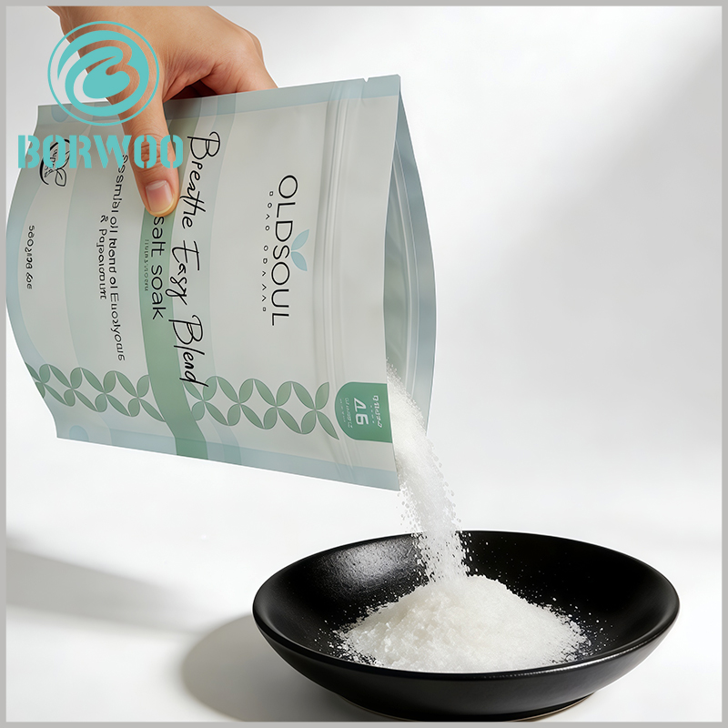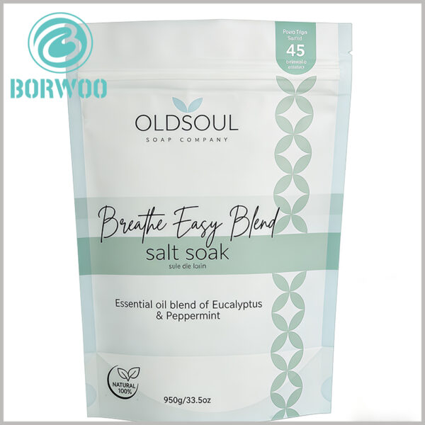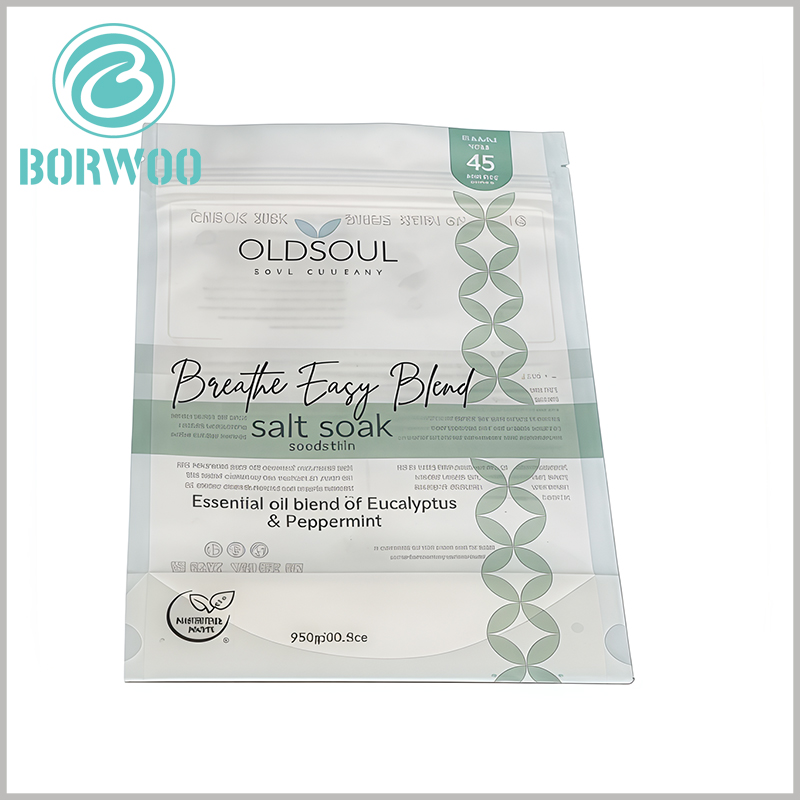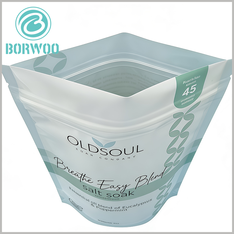 This 950g Epsom Salt Bath Stand-Up Doypack Pouch is tailor-made for bath salt packaging, with precise dimensions to fit 950g capacity perfectly—Overall Dimensions: 153mm (length) × 228mm (height), Base Dimensions: 153mm (length) × 78mm (width). Its sturdy self-standing base (153×78mm) ensures neat display on retail shelves, pharmacies and beauty stores, making your Epsom salt products stand out easily.