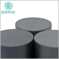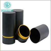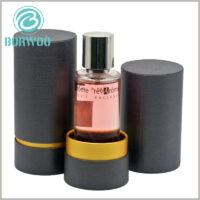 If you are looking for a good black small cardboard tube packaging boxes for perfume bottles this one should be taking a good position in consideration. Made of 400g grey cardboard forming into tubes of 1.2mm thickness, this tube box is robust and reliable, ready to be used for protecting the high value product with good marketing effects. The inner tube is decorated with 350g golden cardboard, giving a luxury impression whereas not very shown-off. The outer façade is compressed with black matted paper, giving a mysterious and elegant style and will certainly be very attractive. Inside the box, a base made with EVA sponge is set to fix the bottle firm to ensure everything right during transportation and usage of the goods. The overall design is simple but impressive, a LOGO printed with embossing on the top of the tube to promote the brand.