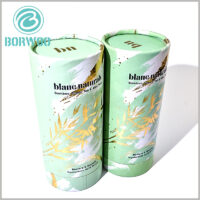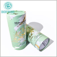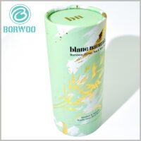 This large cylinder cardboard box packaging, with attractive packaging design, and is different from the ordinary custom cosmetics packaging. For most custom packaging, brand logo and font printing will be made with gilding process, but this package uses gilt printing for some parts, black UV printing for fonts. A large area of the bamboo leaf pattern using gilding process, the entire package looks magnificent. Although the overall background color is mainly grass green, but there are few locations, such as irregular white brush across the block, to increase the natural rough beauty. At the bottom of the packaging, there is bar code printing, which can accommodate more information, is one of the printing module worth considering for a custom packaging. The complexity of the overall package graphic design has very strict requirements for the processing of the edge, but we will do every perfect ex-factory packaging.