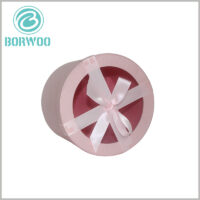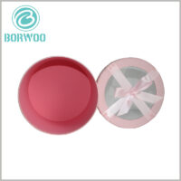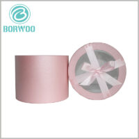 We present you here this pink round tube cardboard packaging box with window on lid for gift wrapping. It is made of high end 350g grey cardboard forming into 1.5mm inner and outer tubes, compressed with pink paper with small motifs on the surface and a wide pink ribbon as decoration. This package looks cute and is very attractive for girls, and can be used for containing many stuffs. Depending on actually needs, we can adjust the design and add many kinds of stuffing inside to fit for your requirements. The ribbon is fixed on the lid, on which there is a window made by PVC plastic to let people see through and observe the content, this is looking good in terms of conception and also economic for mass production, it brings an advantageous price which will favor your business. If you are interested, contact us for more customizations.