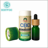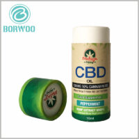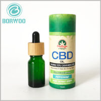 Here we present you this small diameter cardboard tubes packaging box dedicated for 10ml CBD essential oil product, very unique and creative. It is made by 300g SBS with both inner and outer tube measuring 0.8mm thickness, quite robust and protective to a 10ml little bottle. You can see a maple LOGO on it, this is almost for every CBD essential oil package, then you can see the brand name printed by CMYK printing technique. The design is very lovely, some proper green with faded brown shape, and patterns for the brand imaging, this looks attractive and will certainly stimulate customers’ buying will. Another feature that needs to be mentioned is that if you produce this packaging box in a great mass, the cost for the printed tube can be lower to a minimum of 0.1usd/pcs. You may now interested by this peppermint CBD essential oil packaging tube, contact us to start your customization of packaging for free.